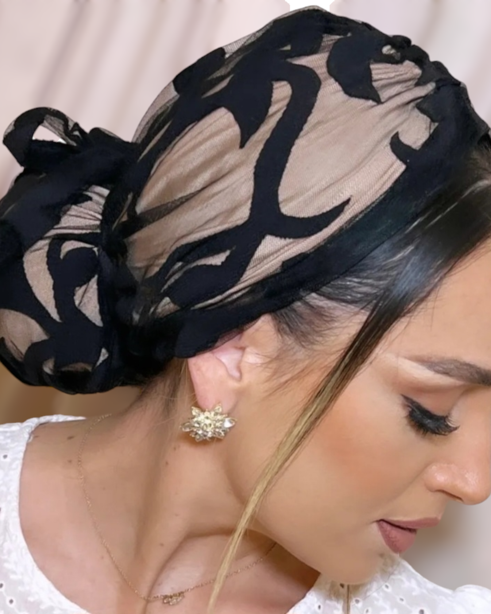• Ready to wear turban with tails to wrap into a bun in the back